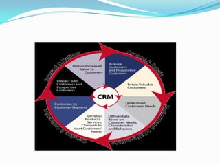 CRM involves collecting customer data to understand customers and enhance their value. It has several key aspects: 1) Acquire and retain customers by delivering value, maintaining interactions, and adapting to customer changes. 2) Understand customers through analysis and interactions to identify valuable segments and their needs. 3) Develop products, services, and channels based on customer segments to customize offerings. 4) Interact and deliver value across all parts of the organization based on customer information and needs.