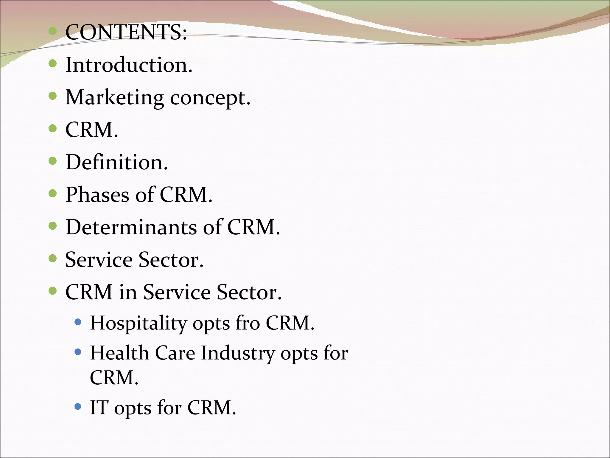 The document discusses customer relationship management (CRM) and its use across various sectors. It defines CRM and outlines its phases and determinants. It then examines how CRM has been adopted by several service sectors, including hospitality, healthcare, IT, education, telecom, banking, finance, insurance and retail. CRM allows companies to acquire, enhance and retain customer relationships and trust through the use of customer data and technology. The document concludes that CRM requires cultural change within organizations and ongoing enhancement of the customer experience to deliver long-term benefits.