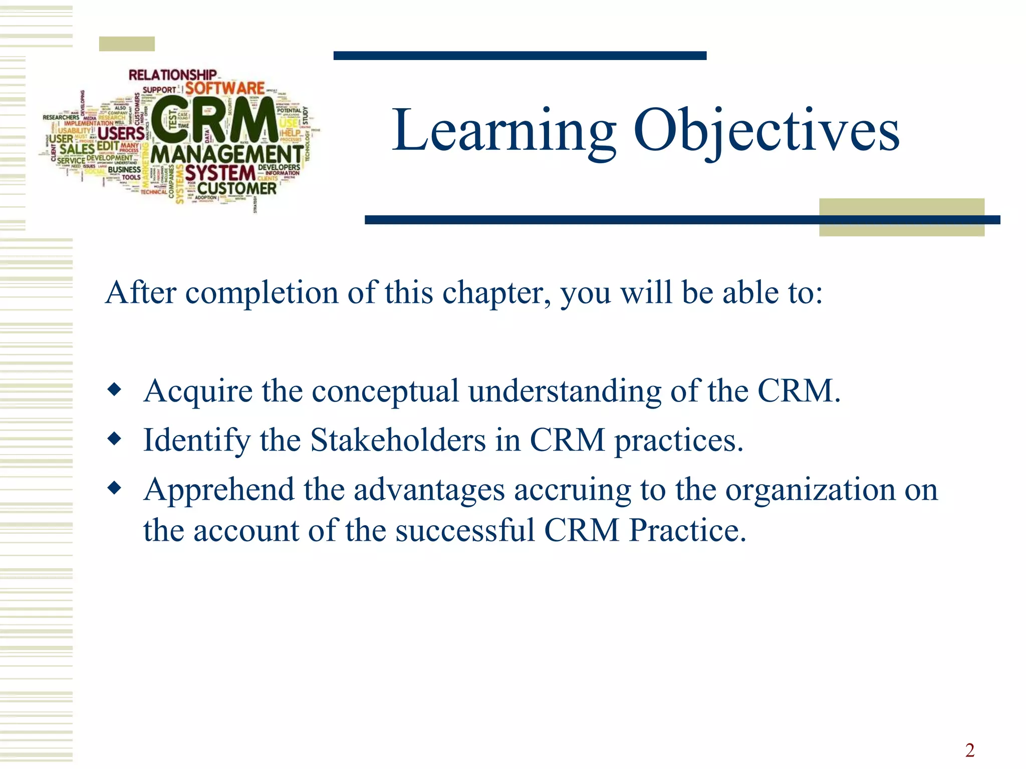 This document discusses customer relationship management (CRM) as a strategic process focused on acquiring, retaining, and partnering with customers to create value. It emphasizes the importance of developing close relationships with customers in a competitive marketplace and outlines key components of successful CRM, including employee involvement and technological support. Additionally, it highlights the benefits of CRM practices, such as increased customer loyalty, revenue generation, and improved understanding of customer behavior.