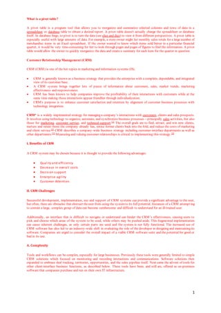 A pivot table allows users to reorganize and summarize spreadsheet or database data to obtain desired reports. It allows users to view data from different perspectives without changing the original data. Pivot tables are especially useful for large amounts of data, allowing users to quickly create summaries. For example, a store owner could use a pivot table to summarize monthly sales totals by merchandise item for a particular quarter.