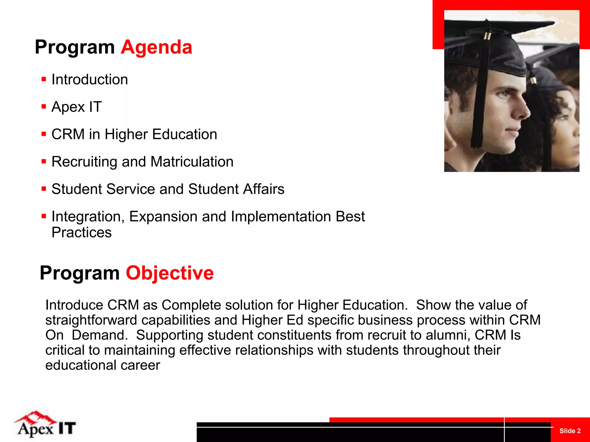 The document discusses the implementation and advantages of Oracle CRM On Demand for managing the entire life cycle of student constituents in higher education, emphasizing the importance of building strong relationships from recruitment through to alumni engagement. It highlights the best practices, benefits, and various modules of the CRM that aid in student recruitment, retention, service, and help desk functionalities, aiming for improved efficiency and student success. Apex IT, as an Oracle certified partner, supports institutions in maximizing their CRM capabilities across multiple applications and processes.