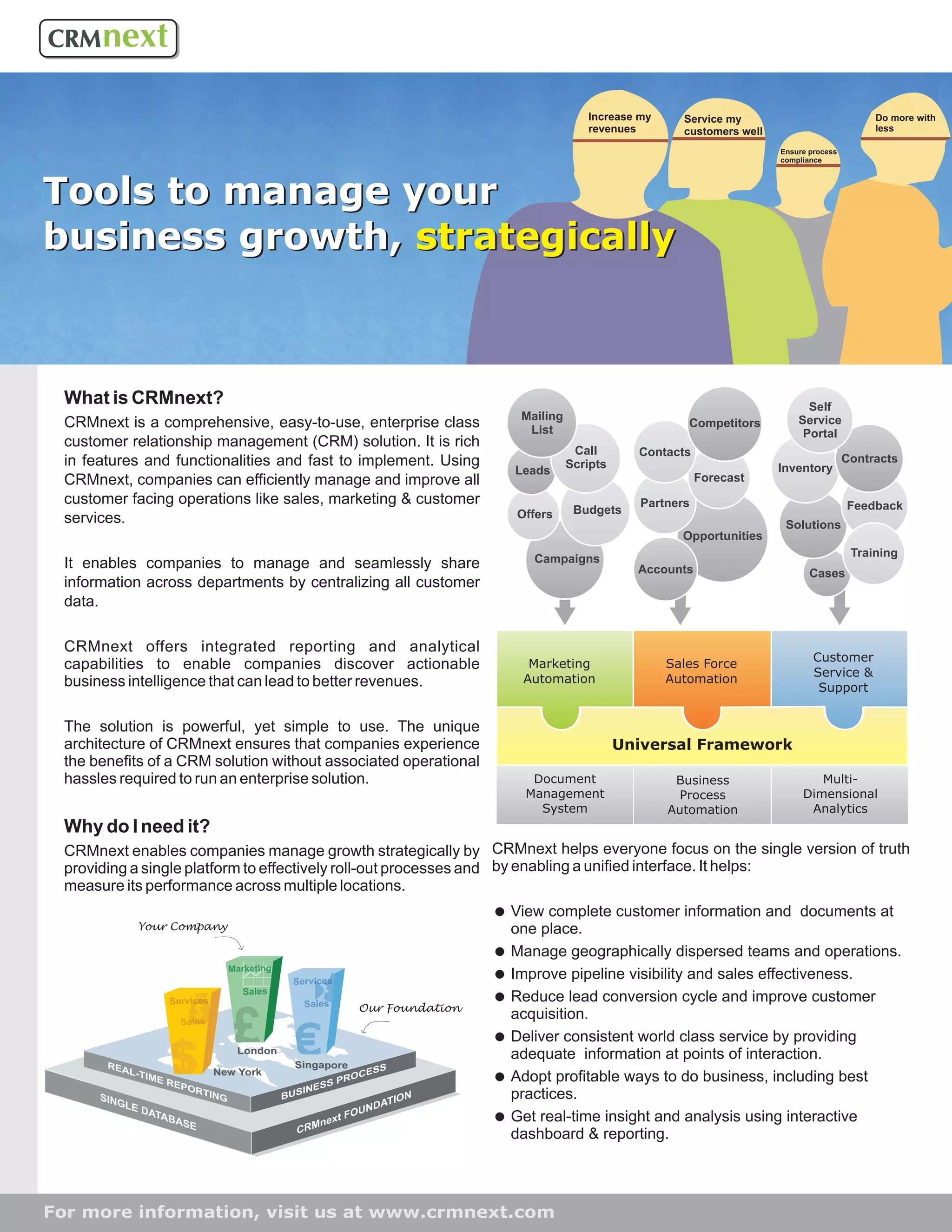 CRMnext is a comprehensive customer relationship management solution that enables companies to efficiently manage customer-facing operations like sales, marketing, and customer service. It centralizes customer data to provide a single view of customers and allows for seamless sharing of information across departments. CRMnext offers integrated reporting and analytics capabilities to provide actionable business intelligence that can help increase revenues. The unique architecture ensures companies can benefit from a CRM solution without operational hassles.