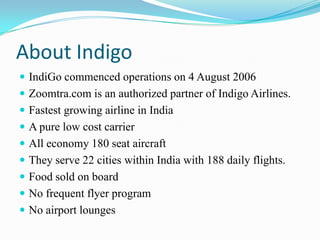 IndiGo is the largest airline in India with 27% of the domestic market share. It operates as a low-cost carrier with 180-seat aircraft and serves 22 cities within India with 188 daily flights. Key aspects include being a pure low-cost carrier, offering only economy seats and selling food on board. It has grown rapidly to become the largest domestic airline in India.