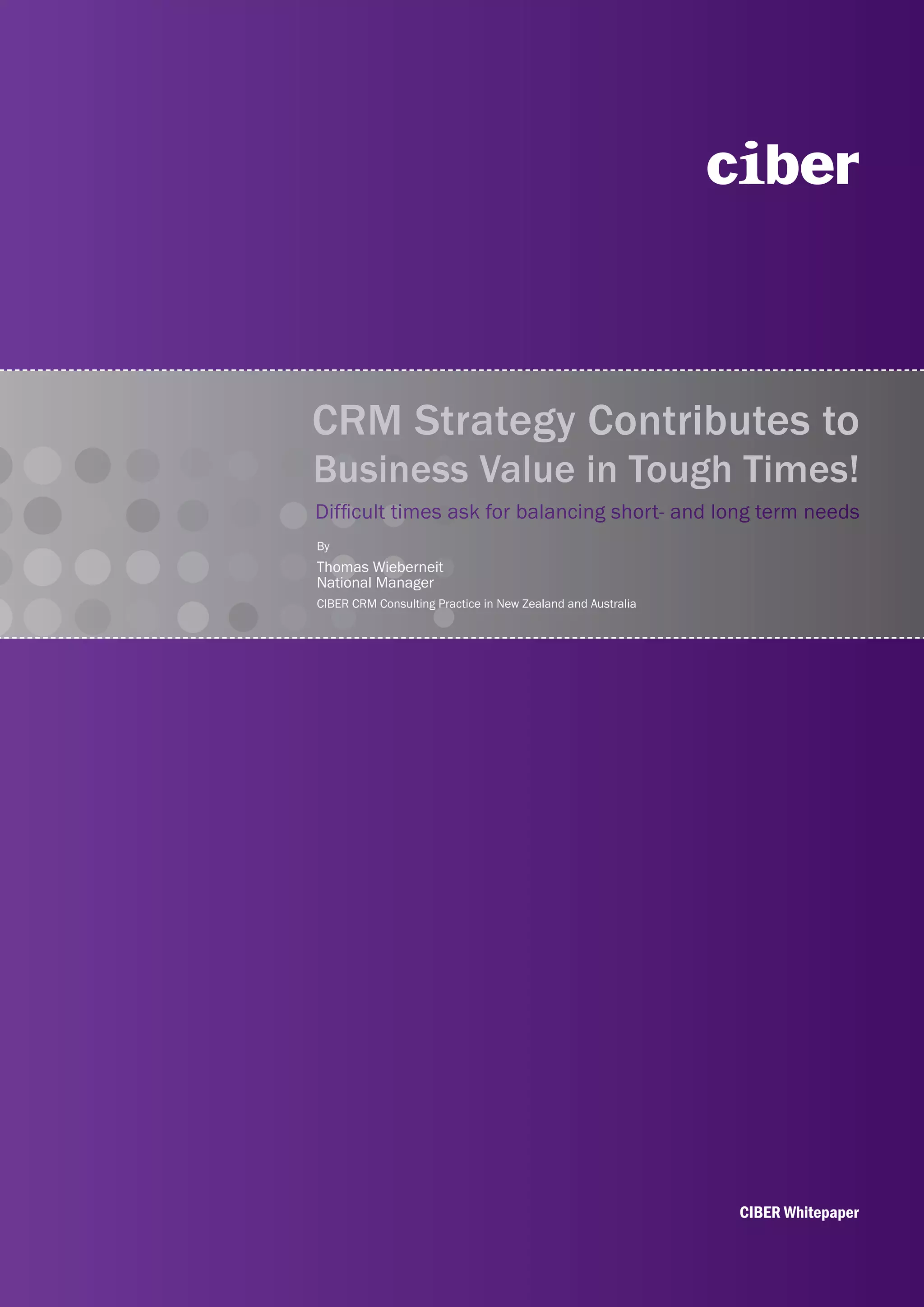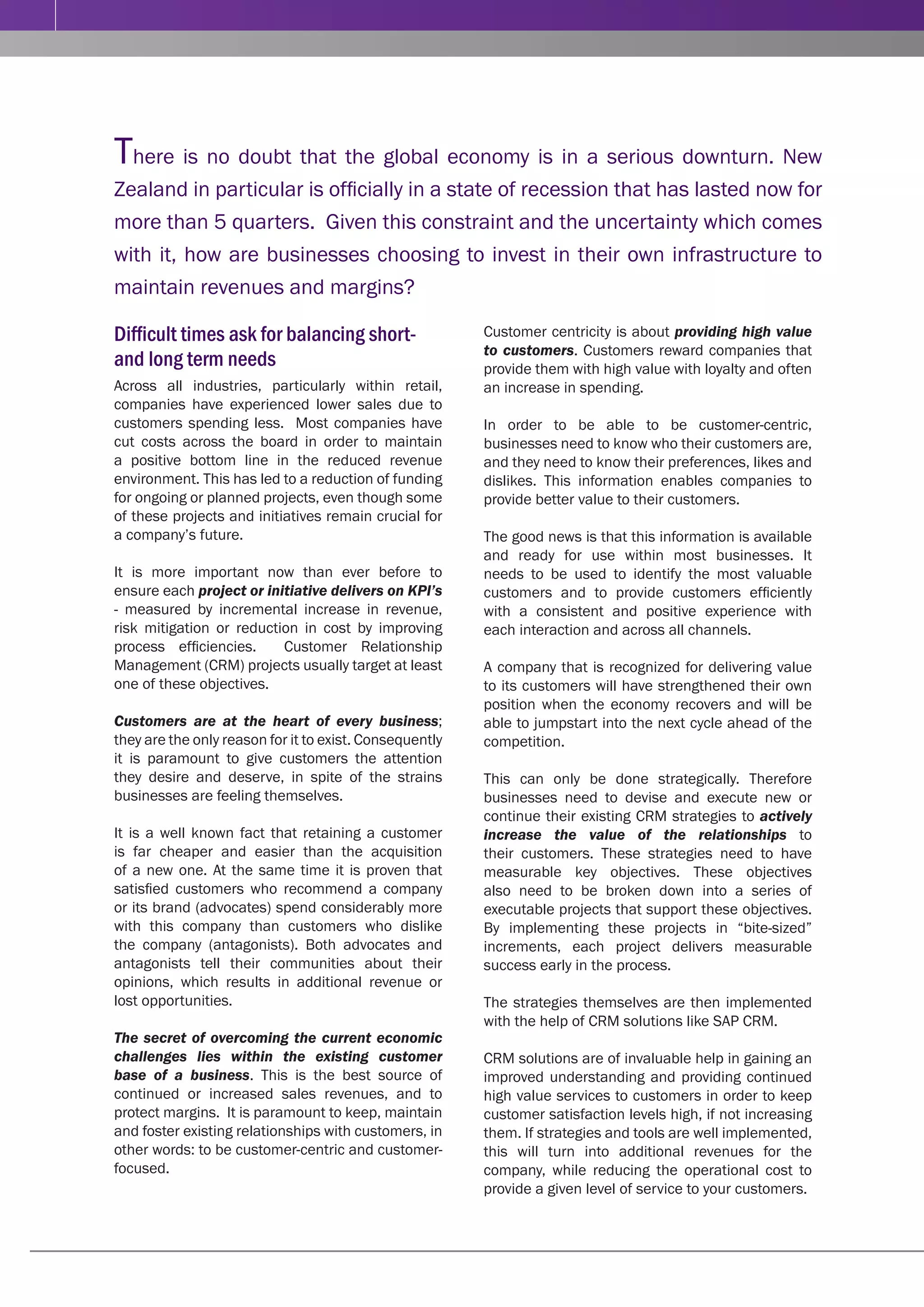 This document discusses how CRM strategies can contribute business value during difficult economic times. It notes that retaining existing customers is important for maintaining revenue and margins when sales are lower. The document recommends that companies focus on their most valuable customers by gathering data from all customer interactions to improve each customer's experience. It also stresses the importance of integrating customer data and channels to provide a consistent customer experience. Finally, the document concludes that focusing on a CRM strategy that embraces customers can help companies gain advantages when the economy improves.
