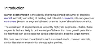 This document discusses market segmentation, targeting, and positioning for customer relationship management (CRM). It defines market segmentation as dividing broad markets into subgroups based on shared characteristics to identify the most profitable segments. Business may segment based on industry, geography, demographics, behaviors, or other factors. The goals of segmentation are to understand customer differences and customize marketing approaches. Targeting involves selecting the most attractive segments identified in segmentation. Positioning assesses a business's competitive advantages to position itself attractively relative to competitors in consumers' minds. The document provides examples of segmentation variables and discusses how segmentation connects different marketing and technology disciplines in CRM.