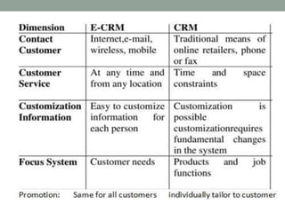 Electronic CRM (ECRM) involves managing customer relationships using information technology to increase customer loyalty, improve marketing and customer service, and reduce costs. ECRM allows for online decision making including identifying customer needs, searching for information, evaluating options, making a purchase decision, and evaluating the purchase.