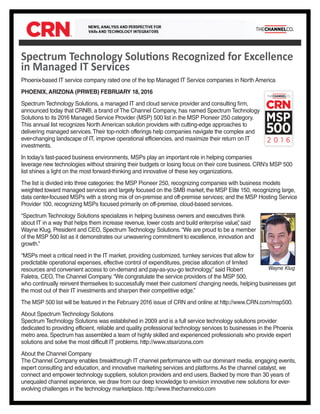 Spectrum Technology Solutions, a Phoenix-based IT services company, was named to the 2016 Managed Service Provider 500 list in the MSP Pioneer 250 category by CRN, recognizing Spectrum as one of the top managed IT services providers in North America. The MSP 500 list highlights innovative companies that help businesses leverage new technologies to improve efficiencies and maximize returns on IT investments. Spectrum's president noted that the company specializes in helping businesses increase revenue, lower costs and build value through strategic IT solutions. The Channel Company CEO stated that MSPs meet a critical need by providing customized services that allow predictable expenses and effective control over limited resources.