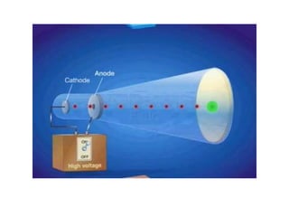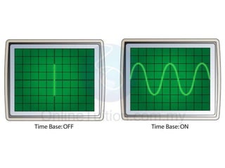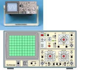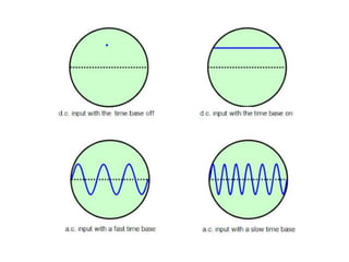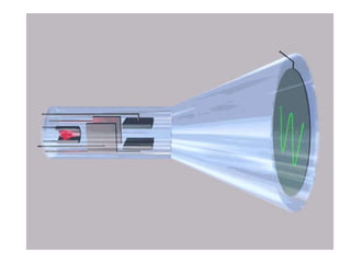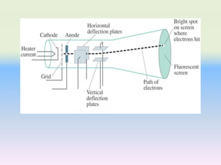 The cathode ray oscilloscope (CRO) uses an electron gun and deflection plates to control the movement of an electron beam across a fluorescent screen, allowing the visualization of electrical waveforms and phenomena. It consists of three main parts: the electron gun, deflection system, and fluorescent screen. The CRO is used to analyze waveforms, transients, and other time-varying quantities across a wide frequency range from low to radio frequencies.
