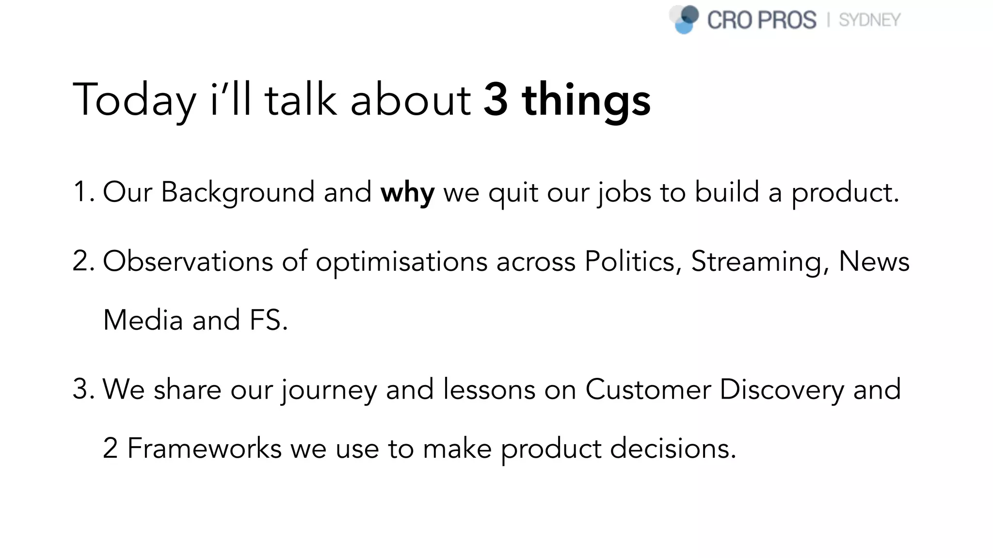 1. The speaker will discuss their background in building products, observations about optimisations across different industries, and their journey and lessons in customer discovery and frameworks for product decisions.