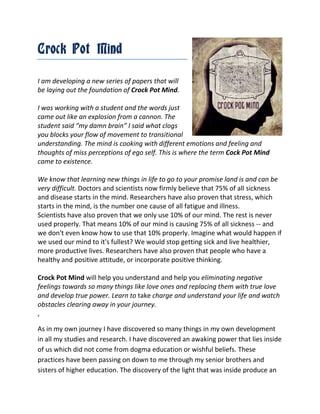 The document discusses the concept of 'crock pot mind,' a metaphor for how our minds process emotions and thoughts, which can hinder personal growth. It highlights research linking mental state to physical health, asserting that 75% of illnesses originate in the mind and emphasizing the potential benefits of using more than the 10% of the mind we typically engage. The author, Dr. Paul W. Dyer, encourages readers to clear their mind of negativity and embrace their inner power for a healthier, more fulfilling life.