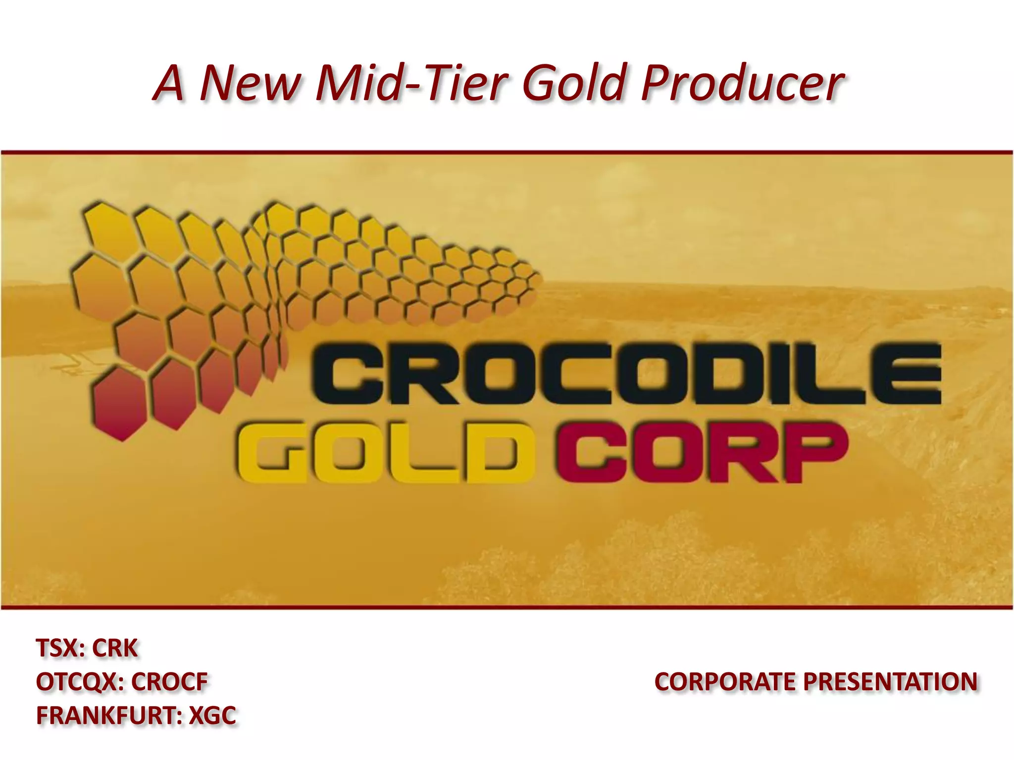 This document provides an overview of Crocodile Gold Corp., a mid-tier gold producer. It discusses Crocodile Gold's assets which include two operating mines in Victoria, Australia (Fosterville and Stawell) as well as three projects in the Northern Territory that are in various stages from production to exploration. Crocodile Gold has consolidated over 3,900 square kilometers of land with proven gold production and has mining infrastructure across its properties. The company is expanding its production profile while decreasing cash costs through developing additional projects.