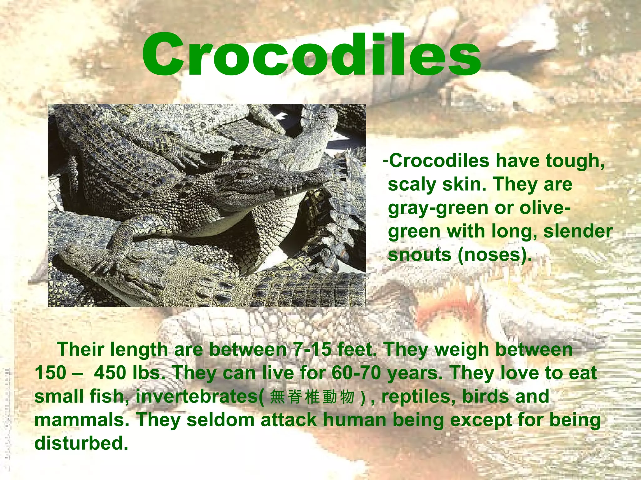 Crocodiles have tough scaly skin and range in length from 7-15 feet. They are found in coastal mangrove wetlands and eat small fish, invertebrates, reptiles, birds, and mammals. The greatest threats crocodiles face are illegal killing, road kill, illegal collection of eggs and live animals for food and skins. Though protected by law, crocodiles are under pressure from threats such as dams and illegal farming.