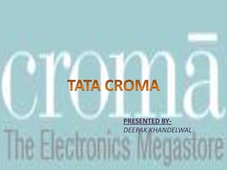 Croma is India's first national retail chain specializing in consumer electronics and appliances. It is owned by Tata's Infiniti Retail Ltd and aims to be a one-stop shop for all consumer technology and durable goods needs. Croma stores range from 15,000-20,000 sq ft and offer over 6000 products across categories like appliances, computers, music/DVDs, communications, gaming, home entertainment, and imaging. Currently, Croma has 15 stores located in 5 major cities across India, with plans to expand to 100 stores nationwide. Croma's brand philosophy is to help customers make informed purchase decisions through knowledgeable advisors and competitive prices.