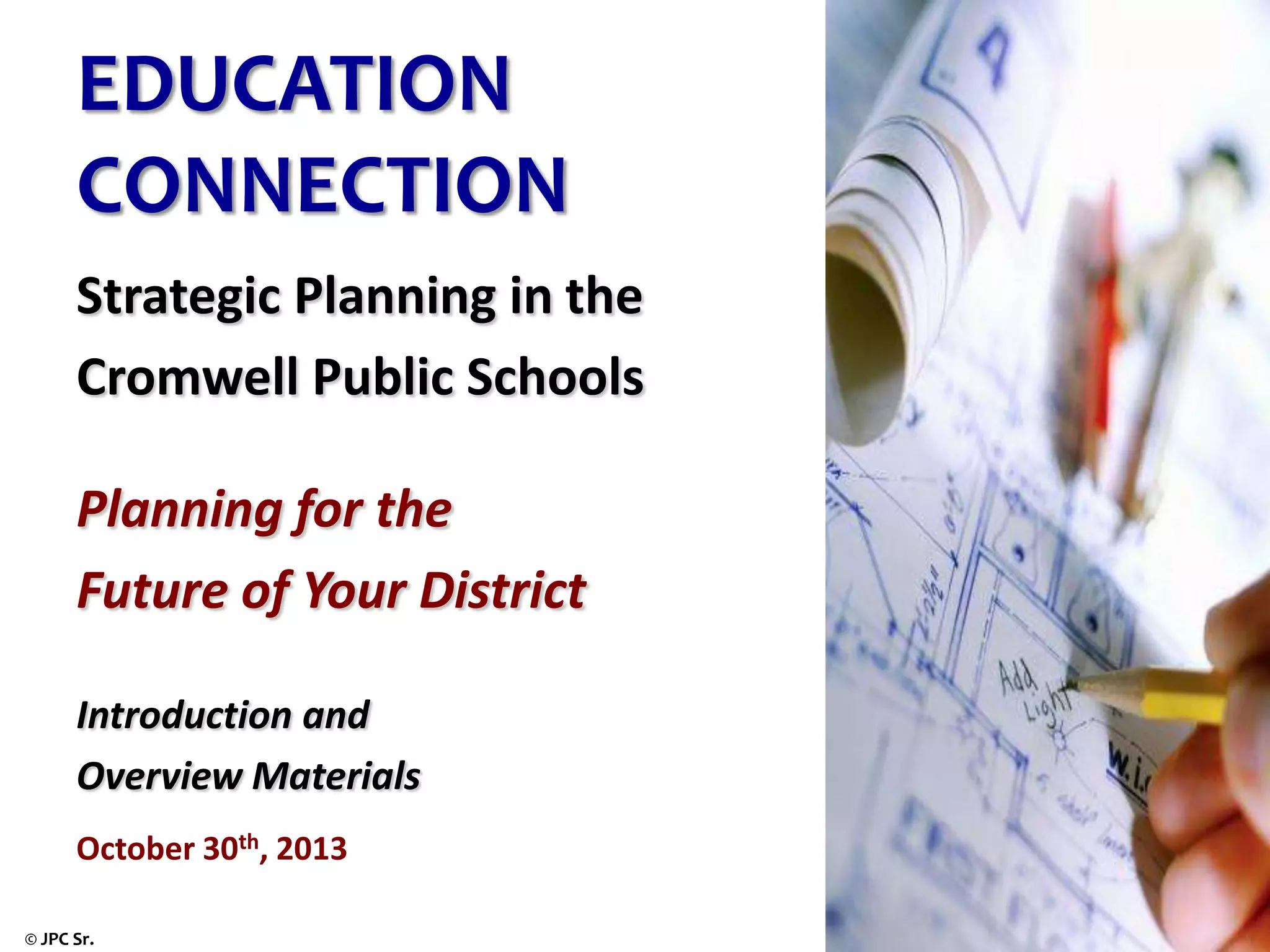 The document provides an overview of materials for strategic planning in the Cromwell Public Schools. It discusses developing a strategic plan that: