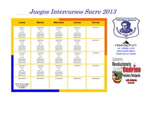 The document contains the schedule for the Juegos Intercursos Sucre 2013 sports tournament taking place from February 25th to March 29th. It lists the dates, participating classes denoted as 4to "A" vs 4to "B" etc., and the sports played each day including kickingball, futsal, and handball. The tournament is organized by Lic. Joemil Lugo of physical education for the afternoon shift.