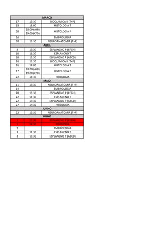 The document lists dates and times for classes in Biochemistry II, Histology, Embryology, Neuroanatomy, and Gastrointestinal System Anatomy. It shows schedules for both theory (T) and practice (P) classes over several months, with some classes like Histology having separate schedules for different groups. Dates are provided from March to July.
