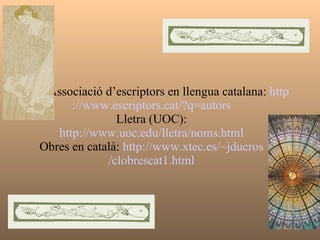 Associaciód’escriptors en llengua catalana: http :// www .escriptors. cat /?q=autors Lletra (UOC): http :// www . uoc . edu /lletra/noms. html Obres en català: http :// www . xtec .es/~ jducros /clobrescat1. html