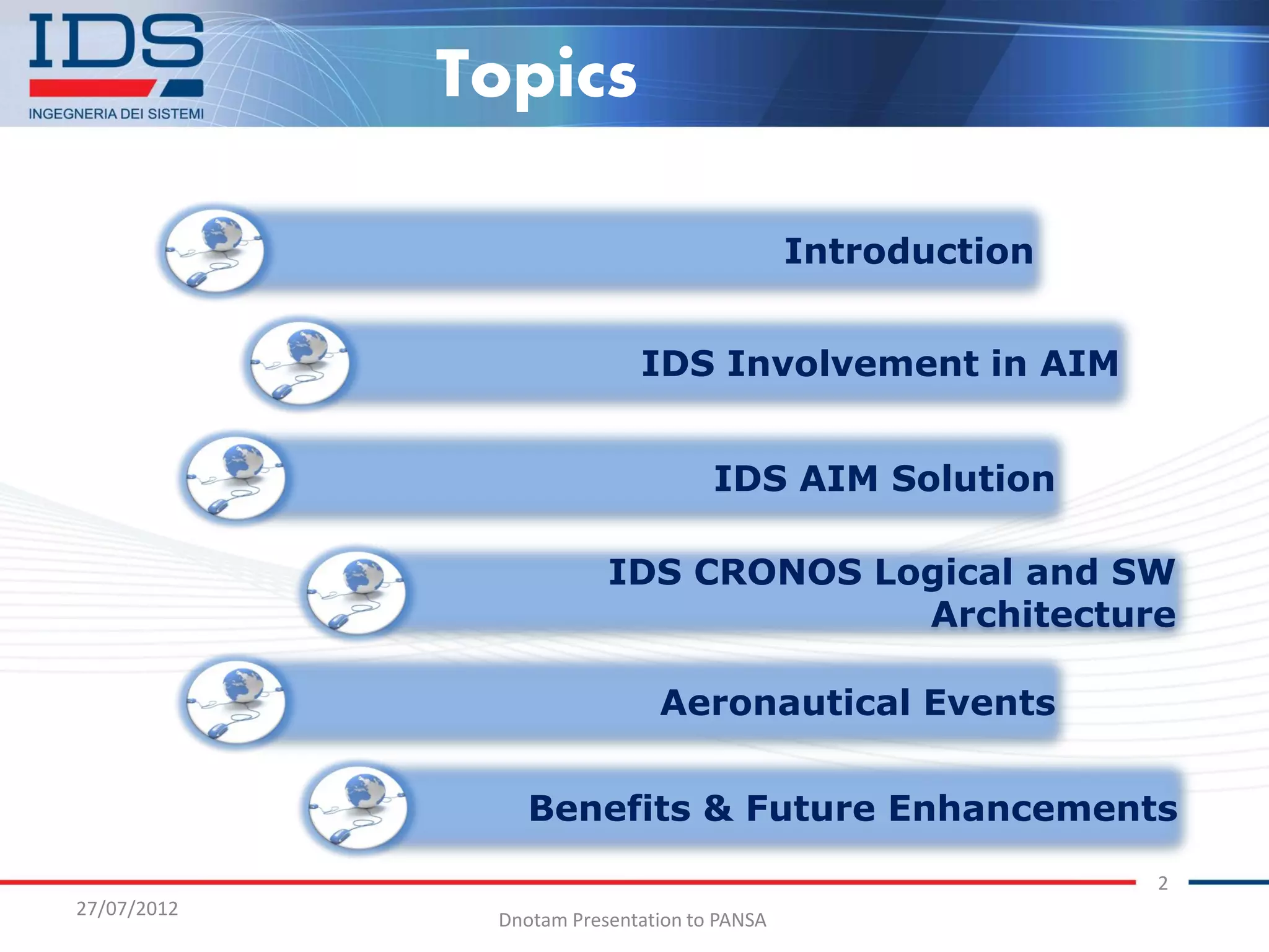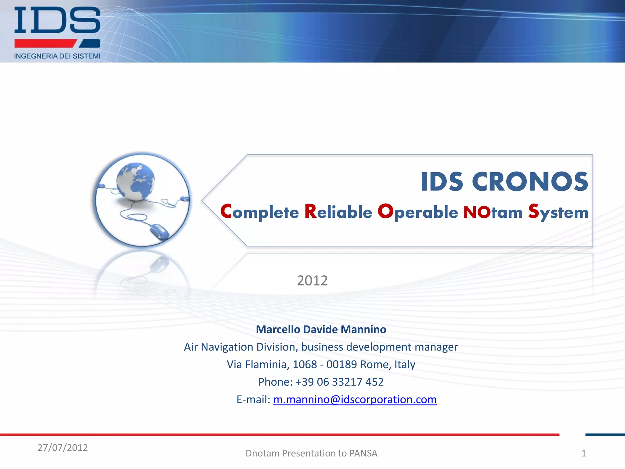 The document provides information about IDS CRONOS, a complete and reliable system for managing aeronautical information from IDS Corporation. It discusses IDS's involvement in aeronautical information management, describing the IDS AIM solution and the logical architecture and software of IDS CRONOS. The system aims to provide benefits such as integrated communication between systems and flexibility to meet future requirements.
