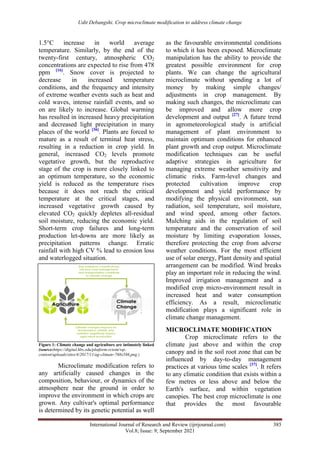 The article discusses the impact of climate change on agriculture, highlighting increased vulnerabilities such as extreme weather events that diminish crop productivity and threaten food security. It emphasizes the importance of microclimate modification as a strategy to improve agricultural resilience by optimizing conditions for crop growth, managing resources like soil moisture and temperature, and utilizing techniques such as mulching. The paper advocates for adaptive strategies in agricultural practices to address climate change challenges and maintain sustainable production.