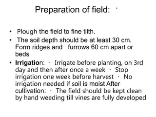 This document provides information on growing various crops including potato, cassava, taro, ginger, yam, and several vegetables. For each crop, it lists recommended varieties, seed/planting rates, planting times and seasons, spacing, fertilizer use, pest and disease management, harvest times, expected yields, and nutritional value. The crops require specific soil and climate conditions for optimal growth and are susceptible to various pests and diseases that must be prevented and managed.