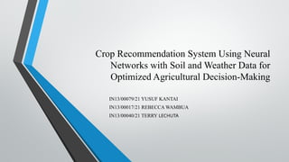 The document discusses the development of a crop recommendation system that utilizes neural networks to optimize agricultural decision-making based on soil and weather data. It addresses the challenges farmers face in selecting suitable crops, emphasizing the integration of AI to enhance productivity and sustainability in agriculture. The study demonstrates a machine learning methodology that achieved significant accuracy in predicting optimal crops, while also suggesting areas for future research to improve crop yield and resource management.