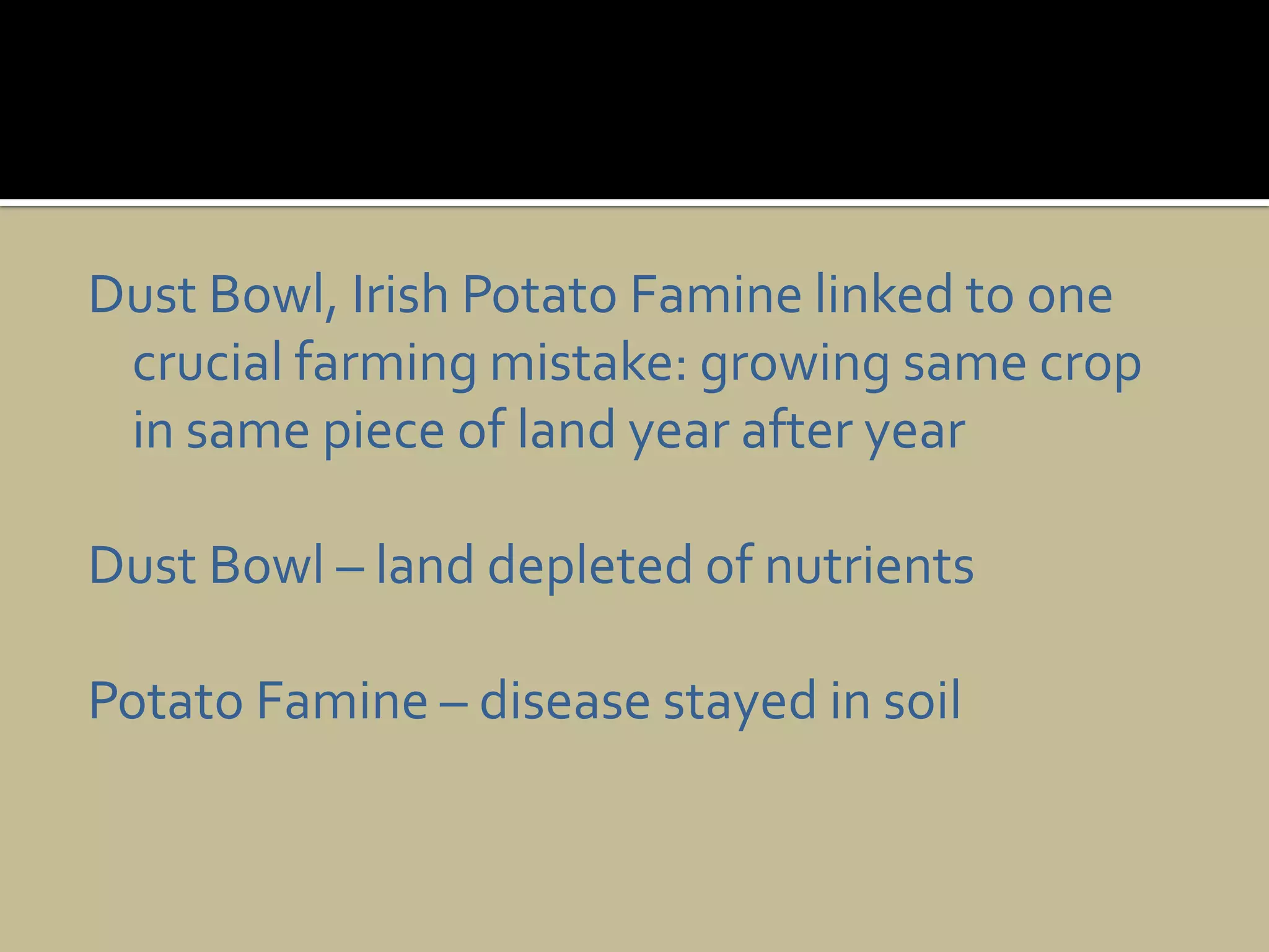 The document discusses the importance of crop rotation for preventing the depletion of soil nutrients and the buildup of pests and diseases. It explains that not rotating crops led to disasters like the Dust Bowl and Irish Potato Famine. Crop rotation involves growing different types of plants in the same area in successive years. This prevents any one nutrient or pest from becoming overly concentrated. The document provides examples of crop rotation plans and families of plants that should not be planted in the same area more than once every few years, such as the nightshade family.