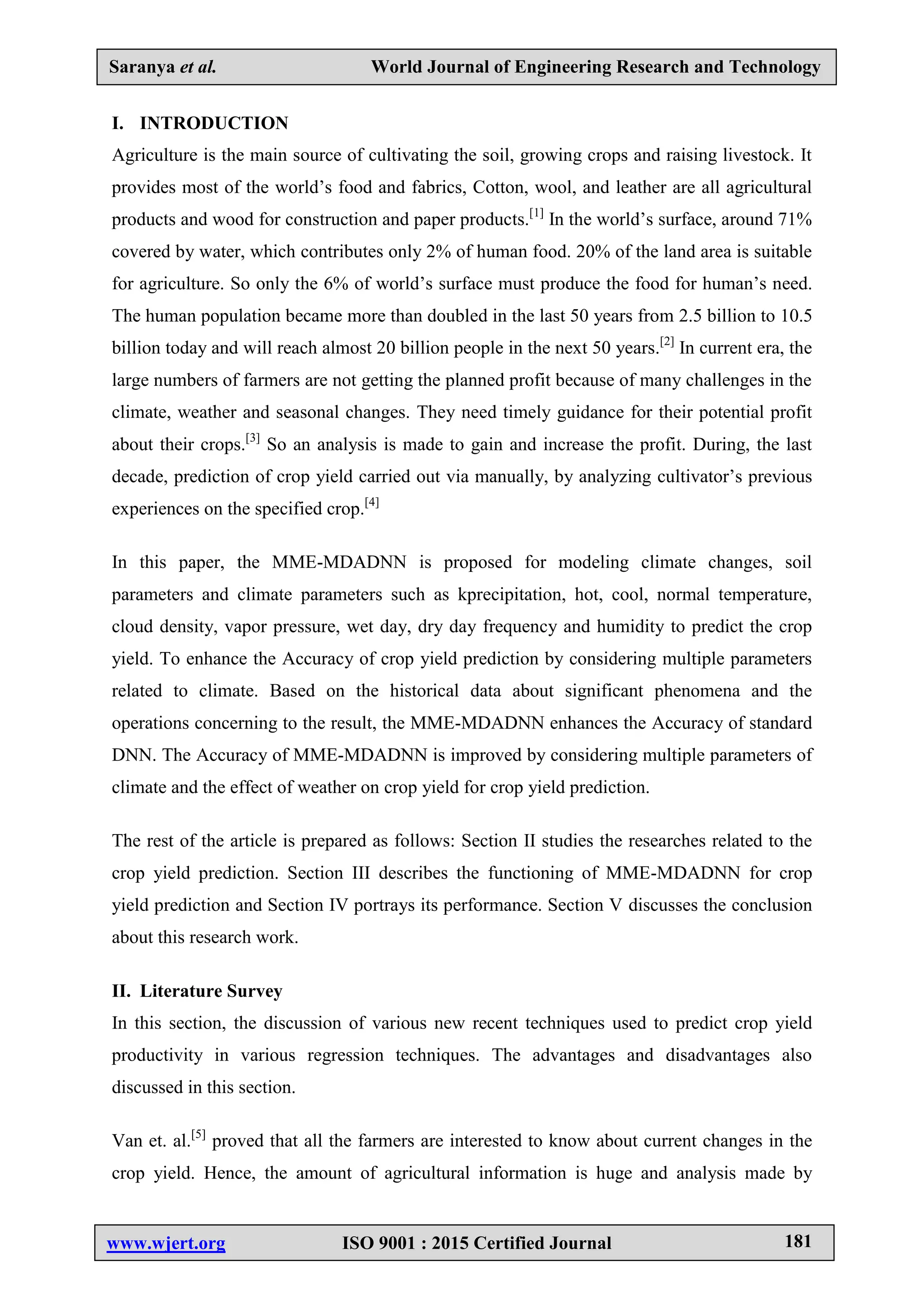 This paper presents the multi-model ensemble modified depth adaptive deep neural network (mme-mdadnn) for crop yield prediction by incorporating climate, weather, and soil parameters, improving traditional methods like support vector regression (svr) and deep neural networks (dnn). The proposed model enhances prediction accuracy by applying ridge regression to address issues of convergence speed, local minima, and overfitting. Experimental results demonstrate that mme-mdadnn significantly outperforms existing models in accuracy, precision, recall, and F-measure for various crops, indicating its potential as a reliable tool in agricultural studies.