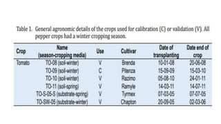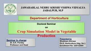The document presents an overview of crop simulation models (CSMs) in vegetable production, detailing their significance in predicting crop growth, yield, and management practices under varying environmental conditions. It discusses various CSM types, their applications like optimizing resources, climate change resilience, and improving decision-making processes, as well as compares specific models such as DSSAT and VegSyst. Additionally, the document highlights the limitations of CSMs and future enhancements for better integration with technologies like remote sensing and machine learning.