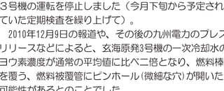 ことなのです。 m内外」でした。温排水の拡散範囲を意図的に小さ 準備書の手続を環境影響評価法は以下のように定 く見せようとしていたわけです。温度通りに等温線 めています。 を引けば、1度上昇の範囲は広大になります。5キ 法16条で事業者の「準備書についての公告及び ロを超えるものも、続々出てきます。 縦覧」の義務を示し、 出るは、出るは、私が確認した2002年以降、 法18条で住民の「準備書についての意見書の提 なんと17枚のインチキがありました。なんと報告 出」の権利を示し、 書の2回に1回、50%のウソツキ率。 法19条では事業者(九電)に、知事及び関係市 町村長へ「意見の概要及び当該意見についての事業 者の見解を記載した書類の送付」を義務付けていま す。 法20条は、それを受けて知事が事業者に意見を 述べる、と定めます。 これらの法は、虚偽または誤った事実を前提にし ていません。仮に法19条で、九電が虚偽または誤 った事実に基づく見解を記載した書類を、知事及び 関係市町村長に送付した場合、法20条により知事 が事業者に意見を述べる際、知事は虚偽または誤っ た事実に基づいて意見を述べることになるのです。 (3)九電は法19条に違反した 18条に基づく住民の意見では、原発周辺の環境 異変について、多くの指摘がありました。それに対 して、九電は、 「1、2号機の温廃水の影響範囲外だ から無関係である」と、切り捨ててきたのです。 朝日新聞 2010.2.3 なぜならば、 「当社が定期的に実施している川内原 朝日新聞でも、大きく報道されました。 子力発電所の温排水影響調査(海域モニタリング) 九電は、急きょ、 「外側の高温域は、温廃水と無関 では、1、2号機運転中における海水温度が 1 度以 係な暖水塊である」と発表しました。あろうことか、 上上昇する範囲は、ほとんどが2km内外となって 鹿児島県もそれを認めてしまいました。 いる」からです。 私たちは鹿児島大、九州大の海流の専門家に聞い 九電は、法19条に基づいて、5カ所にわたって てみました。1人は、 「原発の可否を論ずるつもりは 上記のような見解を記載して、知事及び関係市町村 ない」とことわりながら、 「インチキ以外の何物でも 長あてに書類を送付しました。 ない。100 人が見たら 100 人とも、そう言うだろう」 この「2km内外」が大ウソだったのです。 と話しました。 「放水口から舌状に伸びていることか ら、温排水以外は考えられない」と。 (2)環境影響評価法上の手続きについて では、九電のこのウソが、どのような法律違反に なるのでしょう。 ちょっとややこしいのですが、ご説明します。事 業者(九電)は環境影響評価を行った後、その内容 をまとめた準備書を出します。これも、法に基づく