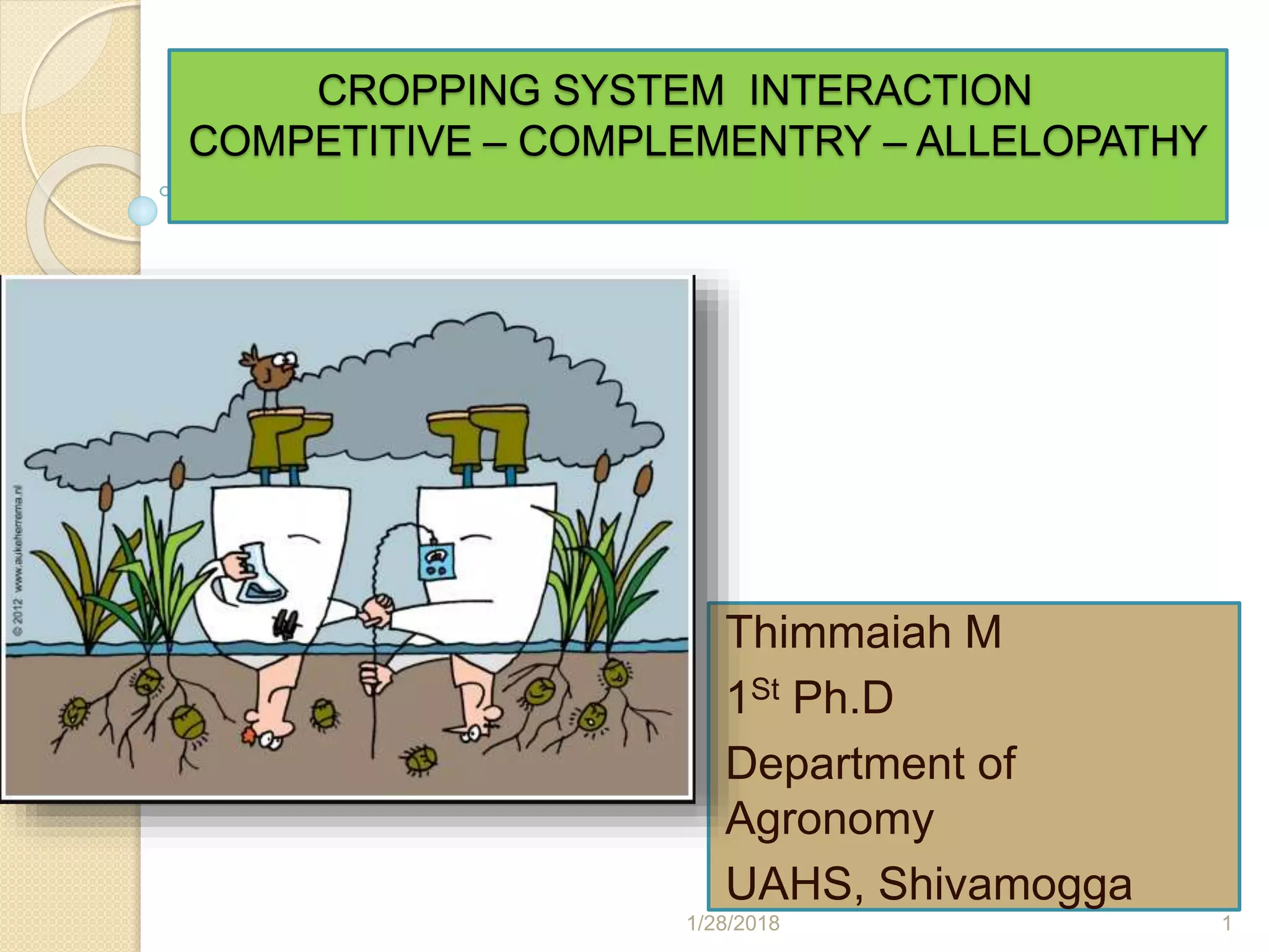 The document discusses interactions in cropping systems, such as competition, complementary effects, and allelopathy among different crop species in intercropping and sequential cropping. It highlights the importance of resource sharing—like light, water, and nutrients—and the mechanisms of competition and stress within plant populations. Additionally, it outlines indices such as Relative Yield Total (RYT) and Land Equivalent Ratio (LER) to measure the productivity and advantages of intercropping systems over monoculture.