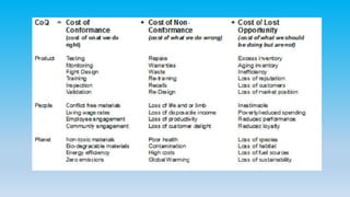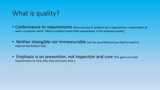 Crosby's philosophy defines quality as conformance to requirements. Quality is measurable and quantifiable rather than intangible. The goal is to meet requirements the first time to prevent defects and reduce costs. Crosby's four absolutes of quality are: 1) quality is defined by conformance to requirements, 2) prevention is preferable to inspection and cure, 3) the standard for quality is zero defects, and 4) quality is measured by the cost of non-conformance rather than defects. The principles of zero defects and "doing it right the first time" emphasize preventing defects to reduce costs associated with rework, scrap, and lost productivity.