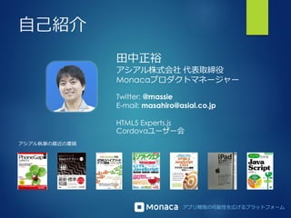 アプリ開発の可能性を広げるプラットフォーム 自己紹介 田中正裕 アシアル株式会社 代表取締役 Monacaプロダクトマネージャー Twitter: @massie E-mail: