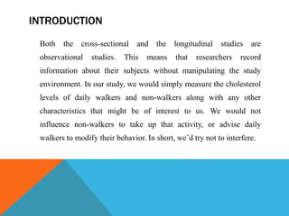 This document compares and contrasts cross-sectional and longitudinal study designs. Cross-sectional studies take a snapshot to compare different population groups at a single point in time, allowing comparison of multiple variables. However, they do not show cause-and-effect relationships. Longitudinal studies observe the same subjects over long periods of time, which allows researchers to detect changes in populations and establish sequences of events, making them better able to suggest cause-and-effect relationships. Researchers may start with a faster cross-sectional study and then conduct a longitudinal study to further examine causes and effects.