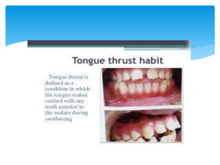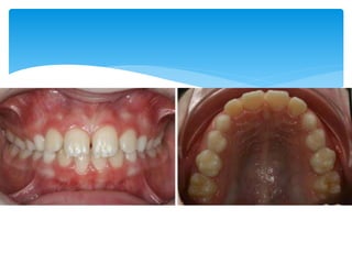 This document discusses different types of crossbite, including buccal, lingual, unilateral, bilateral, dental, skeletal, and functional. Crossbite can be caused by dental anomalies, soft tissue habits like digit sucking, heredity, congenital issues like cleft lip and palate, and trauma. Treatment for crossbite is urgent to prevent TMJ dysfunction, asymmetric growth, gingival recession, and esthetic issues. Various appliances can be used depending on the location and severity of the crossbite, including removable plates with springs, composites, Catalan's appliance, chin cups, myofunctional appliances, quad helix, rapid maxillary expansion, and fixed braces with elastics