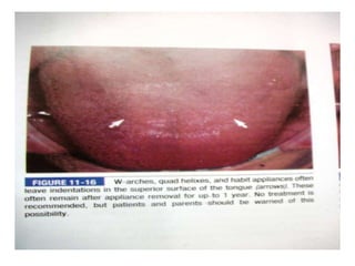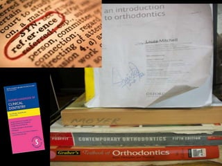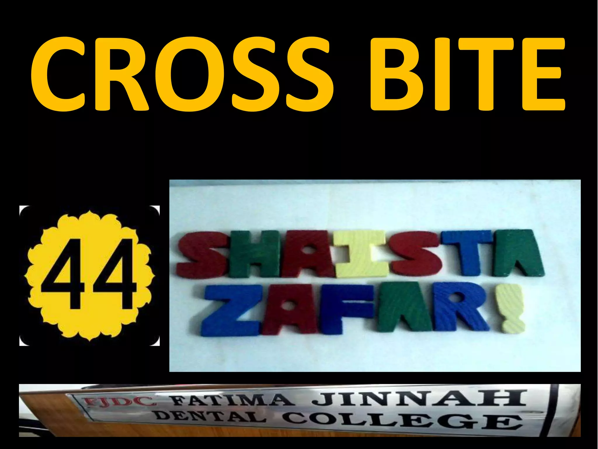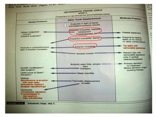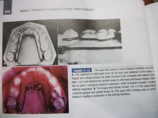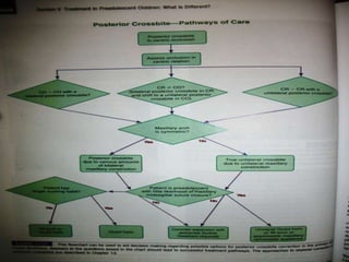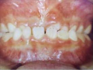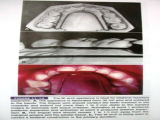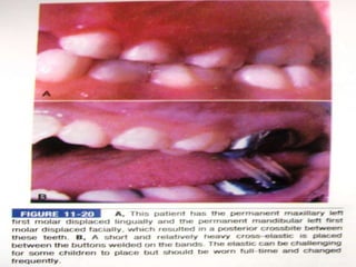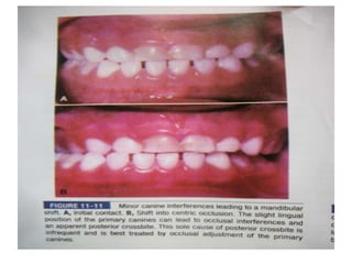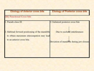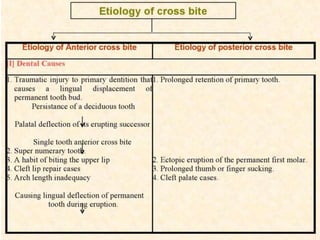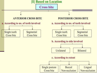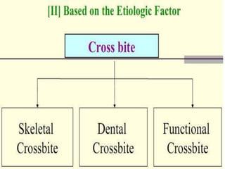 This document defines and describes different types of crossbites, including buccal, lingual, palatal, unilateral, bilateral, functional lateral, complete mandibular, complete maxillary, scissor bite, anterior, and posterior crossbites. It discusses the prevalence, etiology, diagnosis, and treatment of crossbites, which can include the use of inclined bite planes, rapid palatal expanders, and slow palatal expanders in younger patients, and transverse maxillary expansion in older patients. Left untreated, crossbites can cause complications like growth modifications, dental compensations, condylar deviation, and TMJ issues.