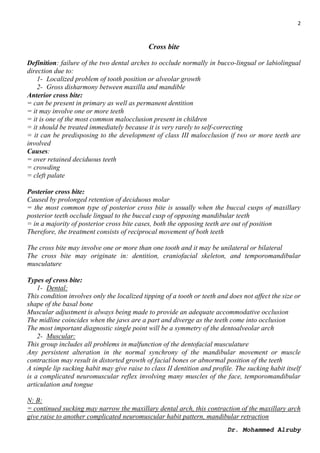 This document defines and describes cross bites, their causes, types, and treatment approaches. It notes that anterior cross bites are one of the most common malocclusions in children and should be treated immediately to prevent worsening issues. Treatment depends on whether the cross bite is dental, muscular, or osseous in nature. For dental cross bites, options include tongue blades, inclined planes, springs, and screw appliances. For skeletal cross bites, face masks or chin cups may be used. Factors like adequate space and overbite must be considered when selecting a treatment approach. Precise measurements are needed before and after treatment to assess changes.