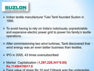 Suzlon Energy acquired German wind turbine manufacturer Repower in 2007 for $1.8 billion. The acquisition brought together Repower's strong research and development, technology teams, and access to European markets with Suzlon's vertically integrated supply chain, global market reach, manufacturing base, and financial resources. The combination created what was intended to be a global leader in wind power solutions with the largest product portfolio and ability to deliver high growth and margins. However, Suzlon struggled after the 2008 financial crisis, facing debt issues and weak market demand exacerbated by the acquisition debt load and problems integrating Repower.