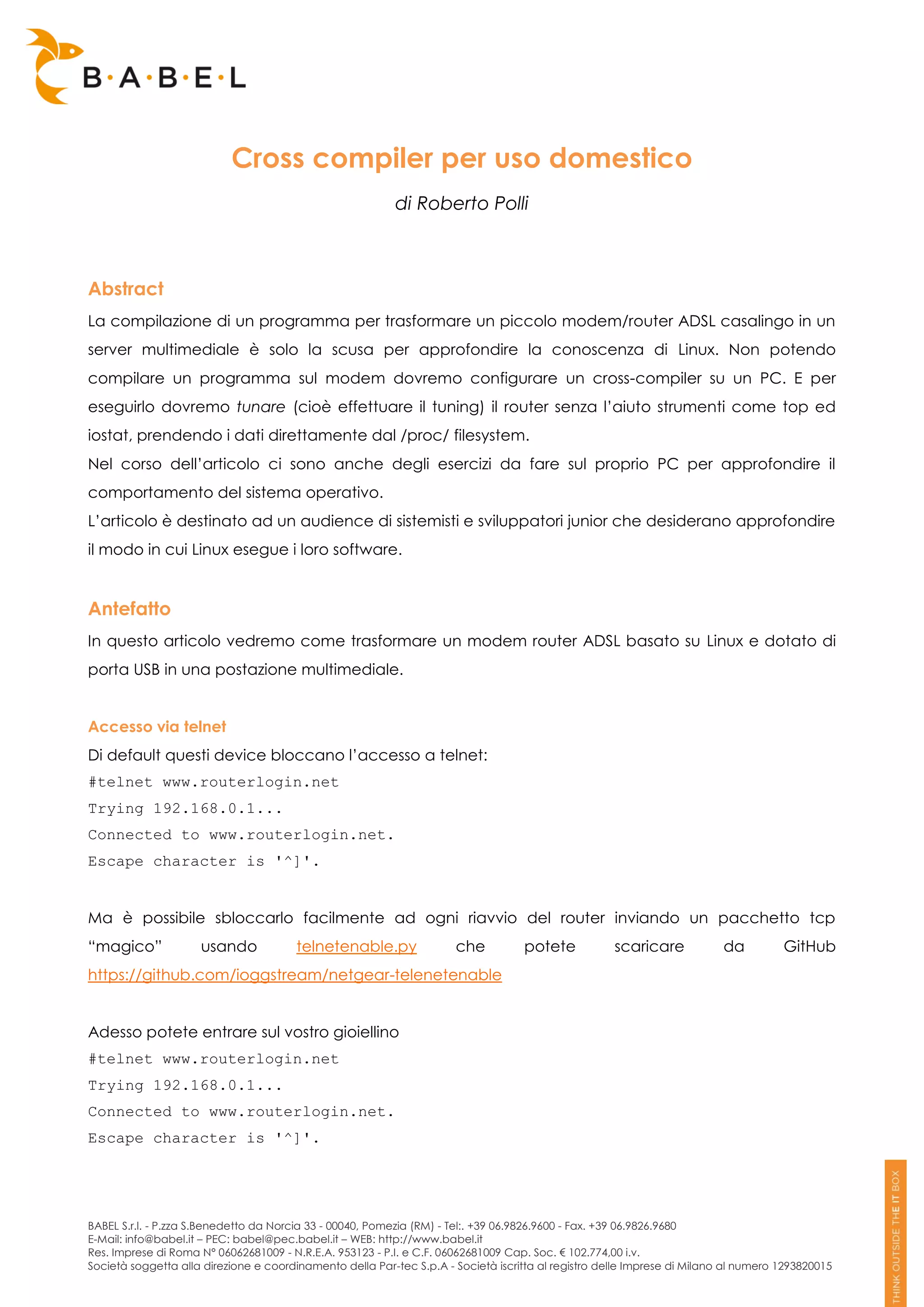 Il documento discute la configurazione di un cross-compiler per trasformare un modem/router ADSL in un server multimediale, approfondendo l'uso di Linux e il monitoraggio delle prestazioni di sistema attraverso il filesystem /proc/. Viene fornita una panoramica sui comandi disponibili e sugli esercizi pratici per analizzare il comportamento del sistema, mirati a sistemisti e sviluppatori junior. Si evidenziano le limitazioni del router, come la mancanza di swap e strumenti comuni, e viene esaminato come gestire memoria e processi in un ambiente minimalista.