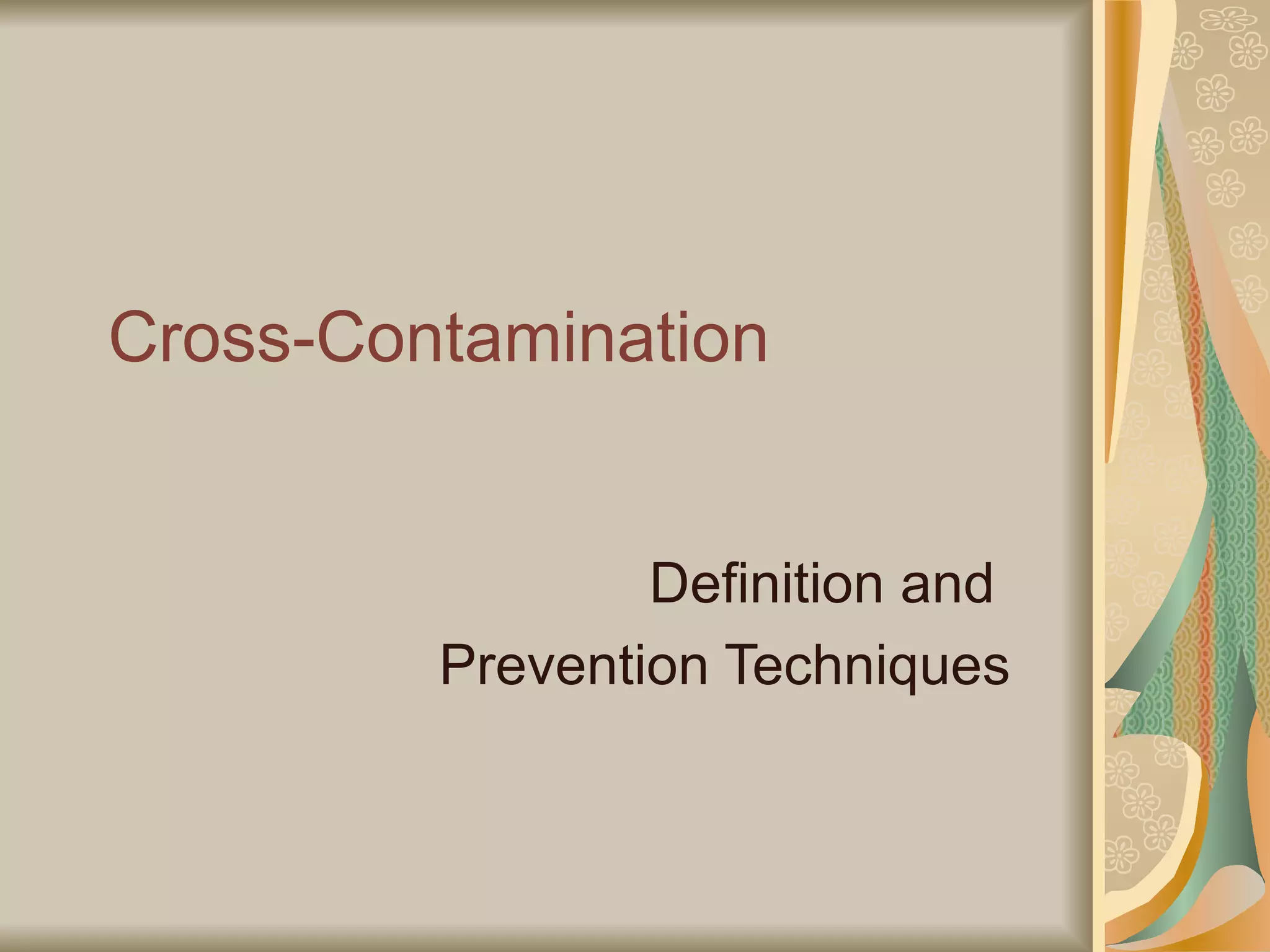 The document defines cross-contamination as the transfer of bacteria between objects or people, often leading to foodborne illnesses. It provides examples of improper food handling practices and emphasizes the importance of hygiene, proper storage, and sanitation in preventing cross-contamination. Recommendations include washing hands and utensils between handling raw and ready-to-eat foods to ensure food safety.
