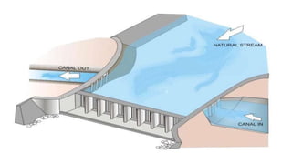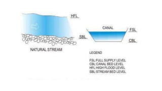 Cross-drainage works refer to structures built where canals intersect natural drainages like rivers or streams. There are three main types: 1) where the irrigation canal passes over the drainage (e.g. aqueduct or siphon aqueduct), 2) where the drainage passes over the irrigation canal (e.g. super passage or siphon super passage), and 3) where the drainage and canal intersect at the same level (e.g. level crossing or inlet and outlet). The type of cross-drainage work constructed depends on factors like the relative bed levels of the canal and drainage, suitable foundation availability, economic considerations, drainage discharge, and construction problems.