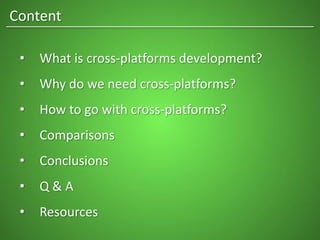 This document discusses cross-platform mobile development. It defines cross-platform development as developing applications that can run on multiple platforms simultaneously. The document then explores different cross-platform approaches like web apps, hybrid apps, interpreted apps, cross-compiled apps, and generated apps. It provides details on how each approach works and when they are involved in the development process. The document also compares the different approaches based on factors like native access, performance, cost, and tools. It concludes that cross-platform options are not fully mature but can be good choices for prototypes, existing web apps, or as a shortcut to the market.