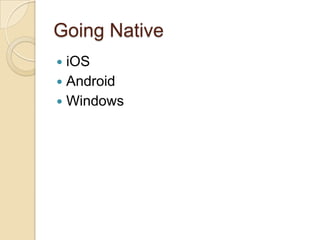 This document discusses cross-platform mobile development in C# using Xamarin. It covers developing apps for iOS and Android natively in C# using activities and delegates. It discusses UI development, async programming, web services, and patterns like MVC. It provides an overview of app lifecycles and managing state on both platforms. The target audience is mobile developers looking to write cross-platform mobile apps in C#.