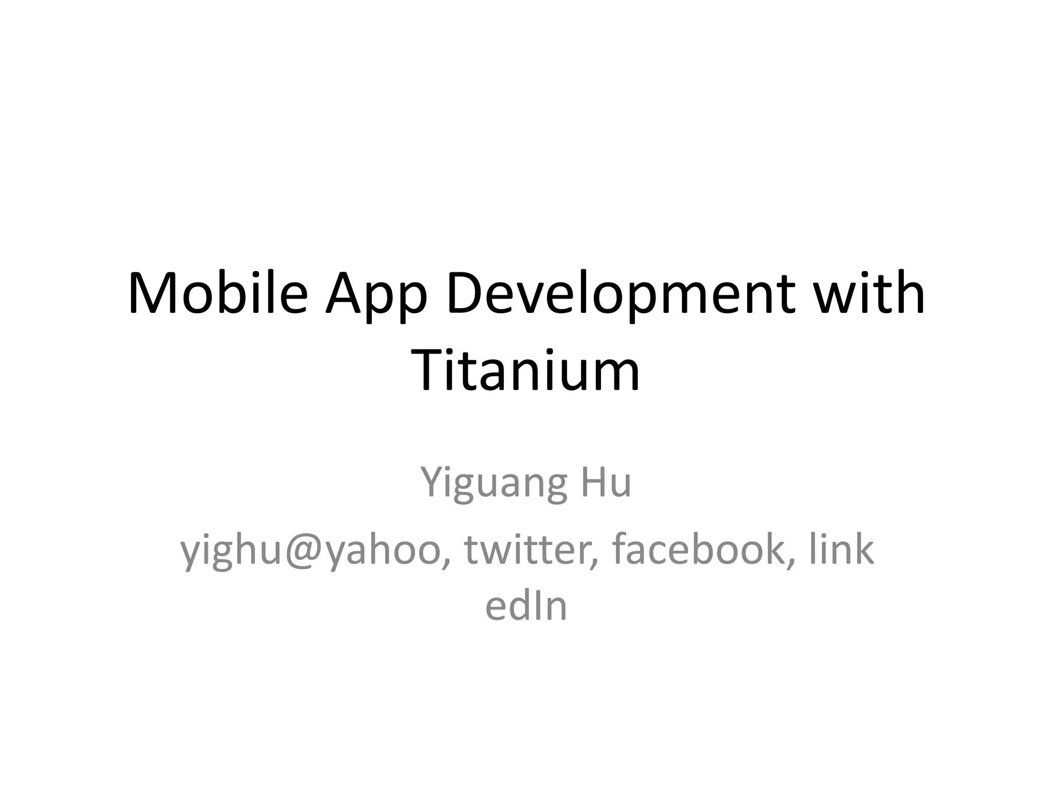 The document discusses mobile app development using Titanium, which facilitates the creation of native, hybrid, and mobile web applications via a single code base. It outlines factors to consider such as platform support, database use, and UI aesthetics, and demonstrates how to create and deploy applications using Titanium SDK. Key benefits include a faster development process compared to traditional methods and extensive support for native APIs.