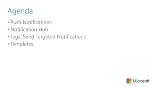 This document discusses sending cross-platform notifications using Azure Notifications Hub and Xamarin. It covers push notification lifecycles, challenges, advantages of Notification Hubs including cross-platform support and interest groups. It also discusses using tags to send targeted notifications, templates for localization and multi-platform support, and managing devices and tags from the backend. Advanced scenarios discussed include "push to sync" to update app state and retargeting notifications based on user data analysis.
