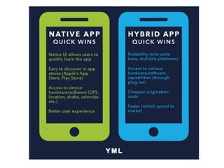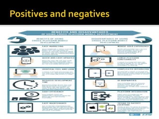 The document discusses the challenges and proposed solutions in mobile application development, specifically focusing on cross-platform apps. It highlights the differences between mobile web apps, native apps, and hybrid apps, emphasizing a single codebase approach using frameworks like Adobe's PhoneGap for easier deployment across multiple platforms. The use of JSON for data handling is mentioned, showcasing benefits such as reduced data traffic and offline capabilities.