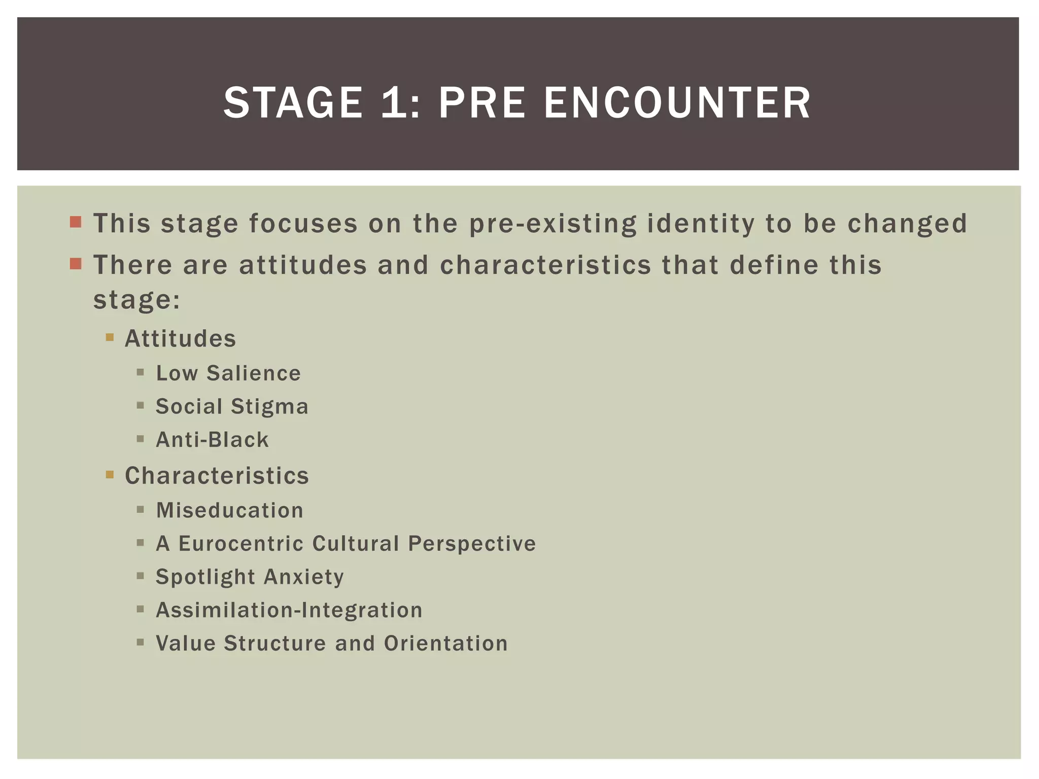 This document summarizes Cross's model of black identity development, known as nigrescence theory. It describes 5 stages: 1) Pre-encounter, characterized by low salience or stigma of black identity; 2) Encounter, where an event challenges pre-existing identity; 3) Immersion-Emersion, a period of transition where the individual rejects old identity and immerses in black culture; 4) Internalization, where the new identity is internalized; and 5) Internalization-Commitment, a sustained commitment to black identity. The model has been extended over time, including concepts of recycling through stages and the influence of Afrocentric perspectives.