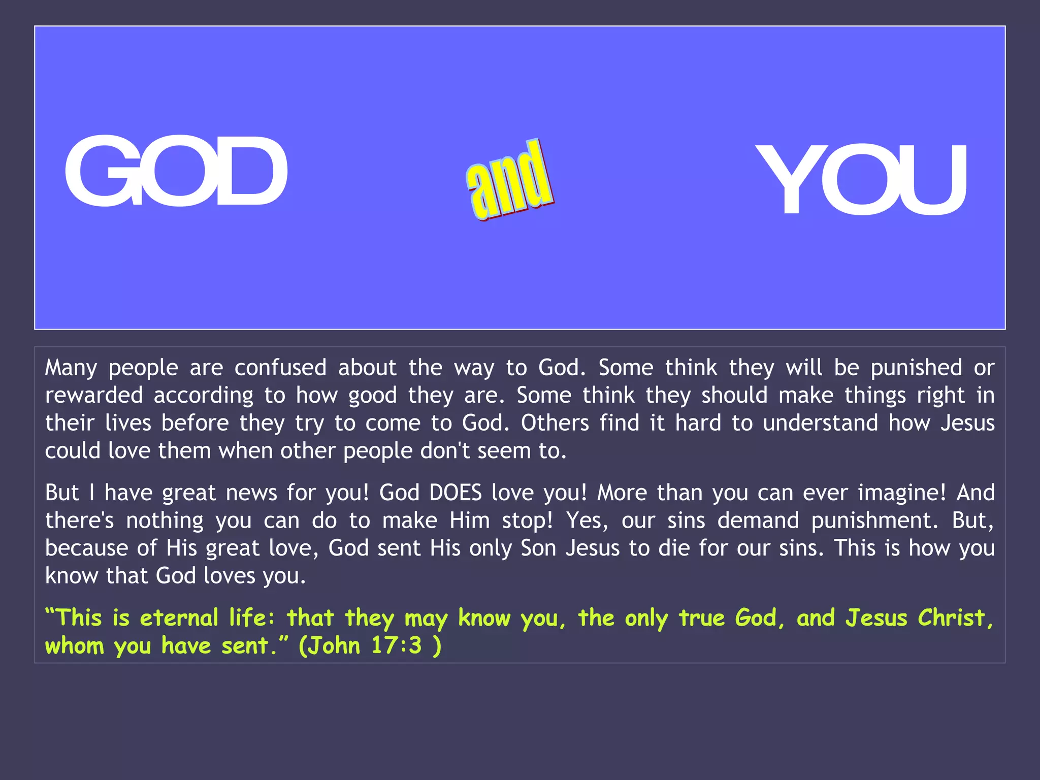 1) God loves all people regardless of their sins or past mistakes. His love is shown through sending Jesus to die for people's sins.