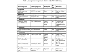 Cross protection occurs when infection of a plant with a mild or attenuated virus strain protects the plant from later infection by a more severe strain of the same virus. This was first demonstrated in 1929 with tobacco mosaic virus. It has since been used successfully to control diseases caused by citrus tristeza virus and papaya ringspot virus. There are two main mechanisms of cross protection - coat protein-mediated resistance, which involves blocking virus uncoating or replication, and RNA-mediated resistance, where excess mild strain RNA hybridizes to block replication of the challenge virus. While cross protection has proven effective for some diseases, there are also limitations such as yield loss, incomplete protection, and genetic instability of the protector virus.