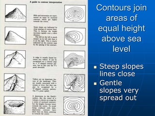 A cross section shows contours joining areas of equal height above sea level, with steep slope lines drawn close together and gentle slopes more spread out. To draw a cross section, dots are placed at the correct heights and smooth lines join the dots. Gradient is calculated by taking the difference in vertical height between two points and dividing it by the actual distance between them on the map scale. Intervisibility refers to whether two points can see each other based on the landscape features between them.