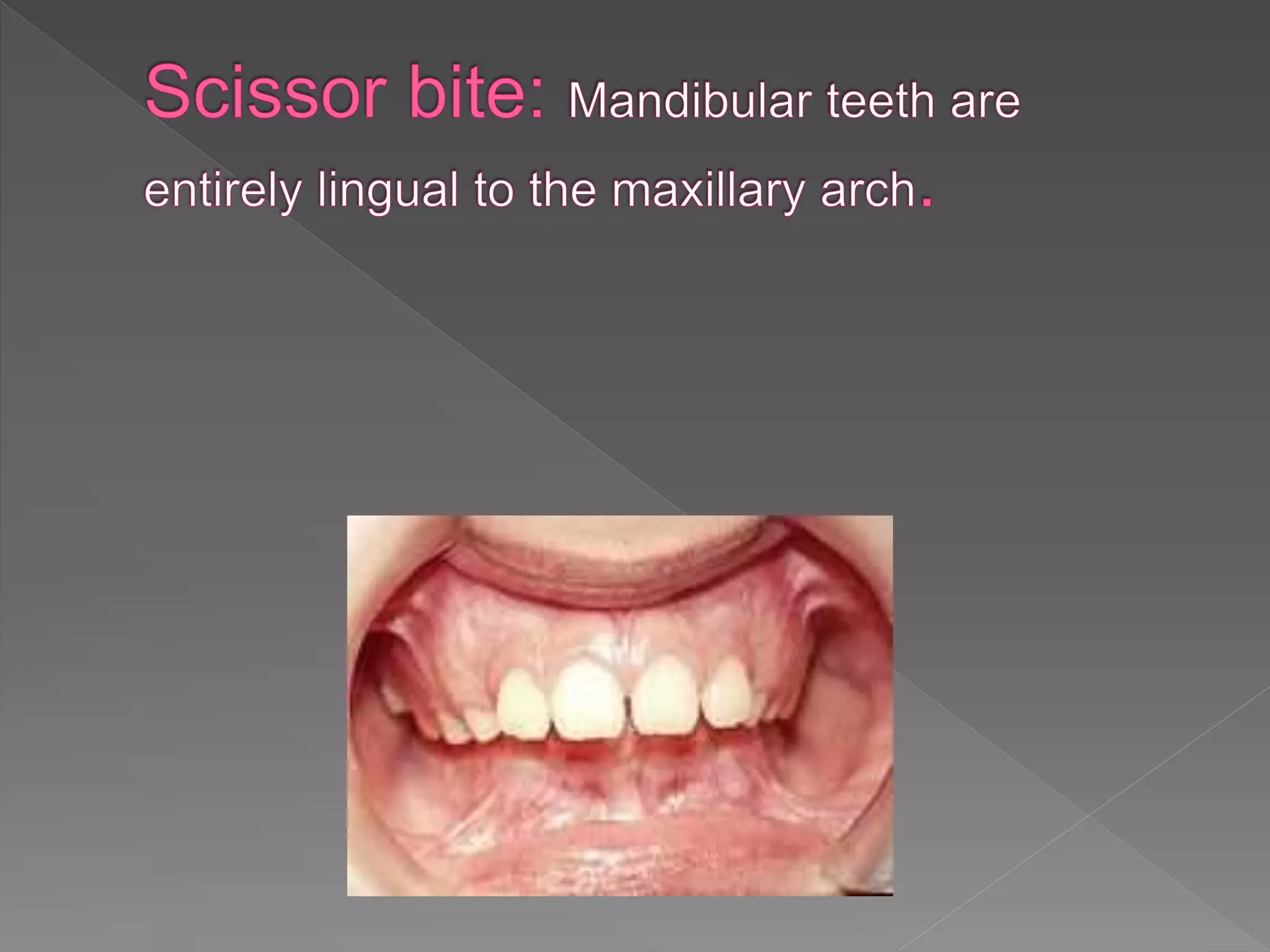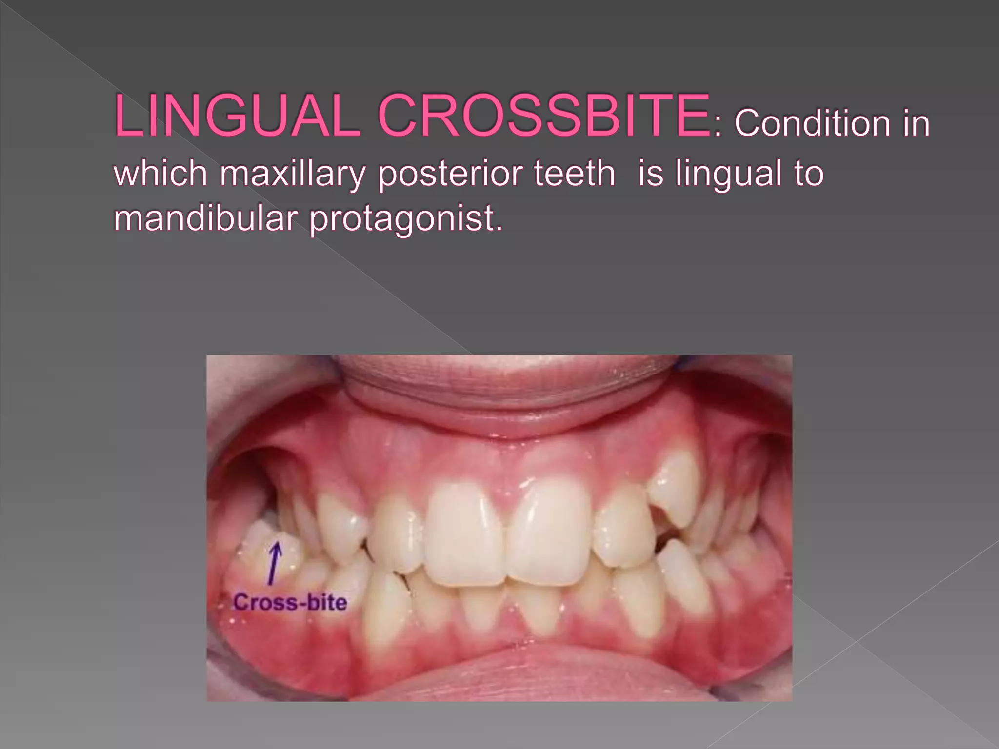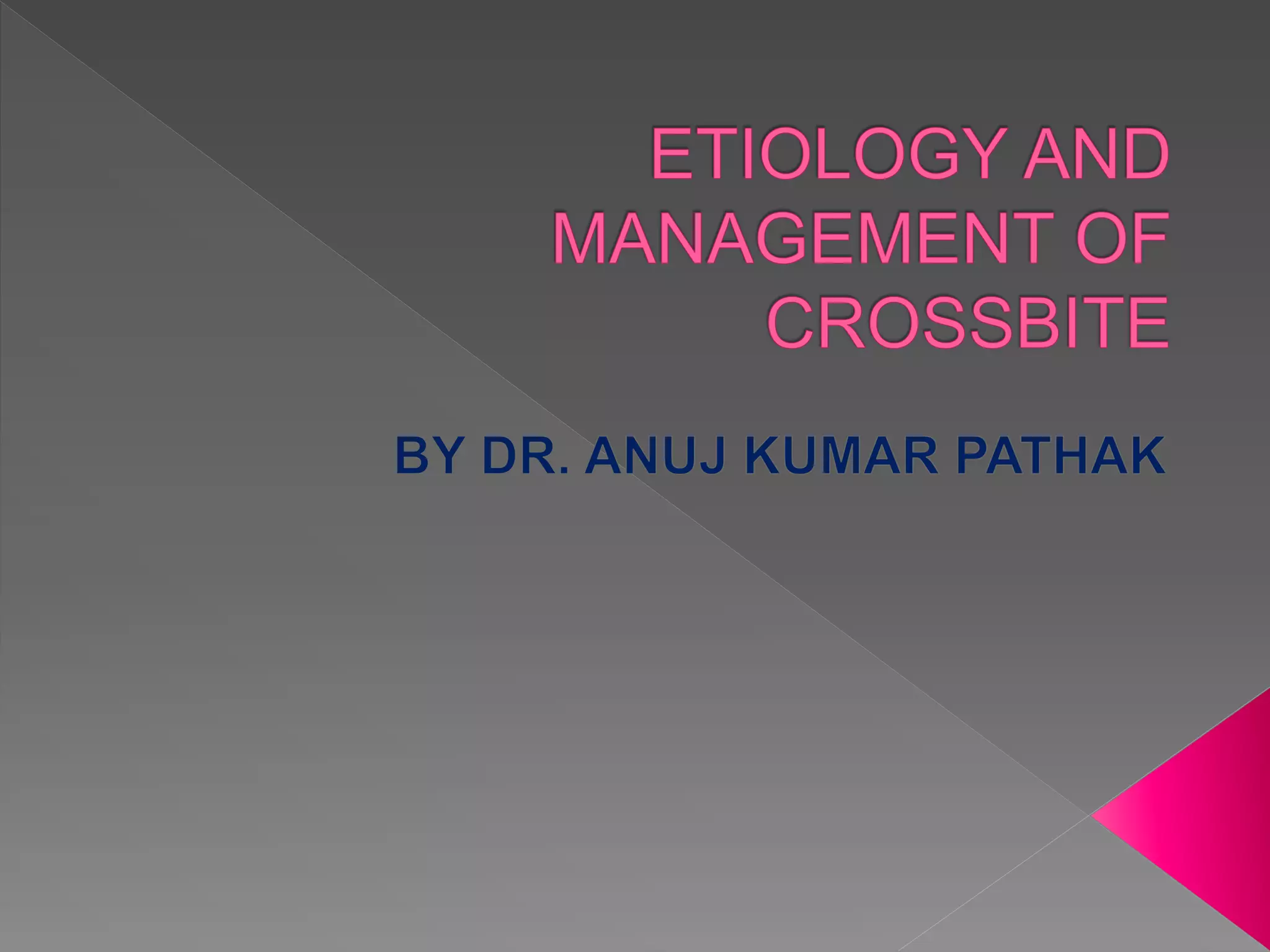 The document discusses crossbite, defining it as an abnormal tooth relationship affecting occlusion, with various classifications and etiological factors such as dental and skeletal issues. Treatment strategies range from simple incisal grinding to complex appliance therapies, tailored to factors like tooth movement, available space, and patient cooperation. It emphasizes the importance of addressing crossbites in both primary and permanent dentition, highlighting potential long-term implications if left untreated.